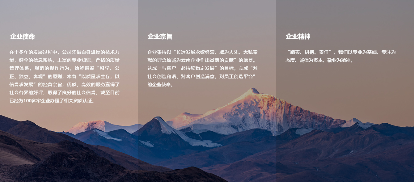 企業秉持“長遠發展、永續經營、敢為人先、無私奉獻”的理念,以“熱忱為云南企業做出微薄貢獻”的愿景,達成“與客戶一起持續穩定發展”的目標,完成“為社會創造和諧、為客戶創造滿意、為員工創造平臺”的企業使命。